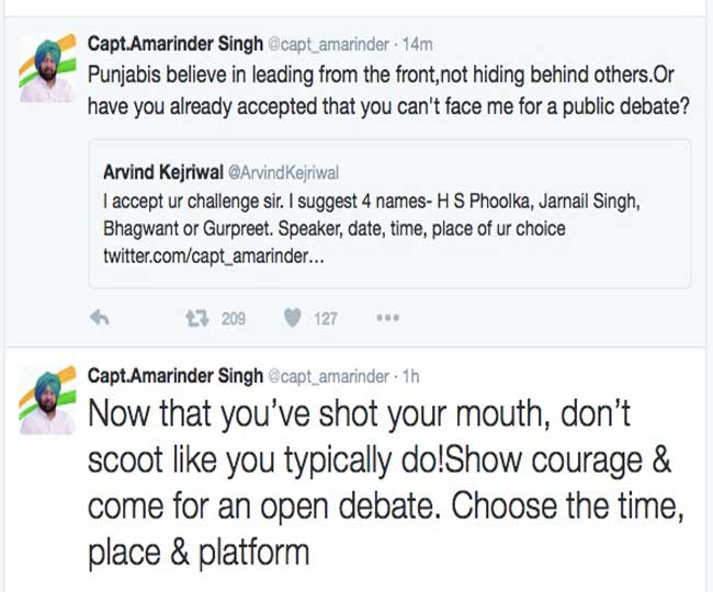 दाेनों की ट्वीट जंग यहीं नहीं रुकी और इसके बाद बात चुनौती तक पहुंच गई। कैप्टन अमरिंदर सिंह ने केजरीवाल को खुली बहस की चुनौती दे डाली। कैप्टन ने केजरीवाल को ट्वीट किया- '' अब अपना मुंह बंद करो और अब भागोे मत जैसा कि अब तक आम तौर पर करते आए हो! हिम्मत दिखाओ और खुली बहस के लिए सामने आओ। समय, स्थान और मंच तक कर लो।''
