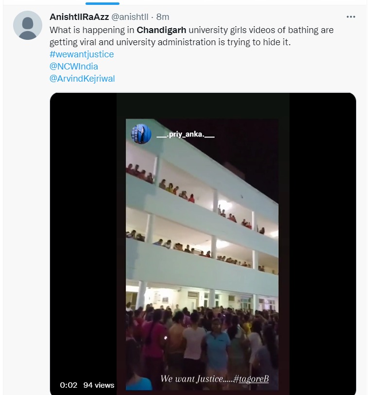 भड़के स्टूडेंट्स ने शनिवार देर रात चंडीगढ़ यूनिवर्सिटी को घेर लिया और वी फार जस्टिस की नारेबाजी करने लगी। बताया जा रहा है की जिस युवती ने वीडियो बनाए हैं उसे हास्टल के एक कमरे में बंद करके रखा गया है, ताकि उस पर हमला न हो जाए।