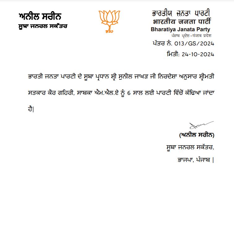 मामले को देखते हुए बीजेपी ने सत्कार कौर को छह साल के लिए निलंबित कर दिया है। जारी आधिकारिक पत्र के अनुसार, भारतीय जनता पार्टी के प्रदेश अध्यक्ष सुनील जाखड़ जी के निर्देशानुसार पूर्व विधायक सत्कार कौर गहरी को 6 वर्ष के लिए पार्टी से निष्कासित कर दिया गया है।