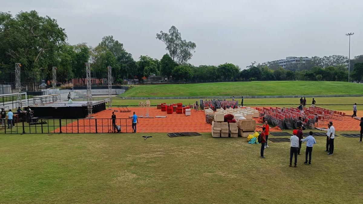 कार्यक्रम की तैयारियों में जुटे कर्मचारी।
