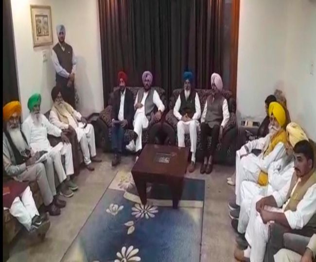 कैबिनेट मंत्री कुलदीप सिंह धालीवाल के साथ बैठक करते हुए किसान नेता।