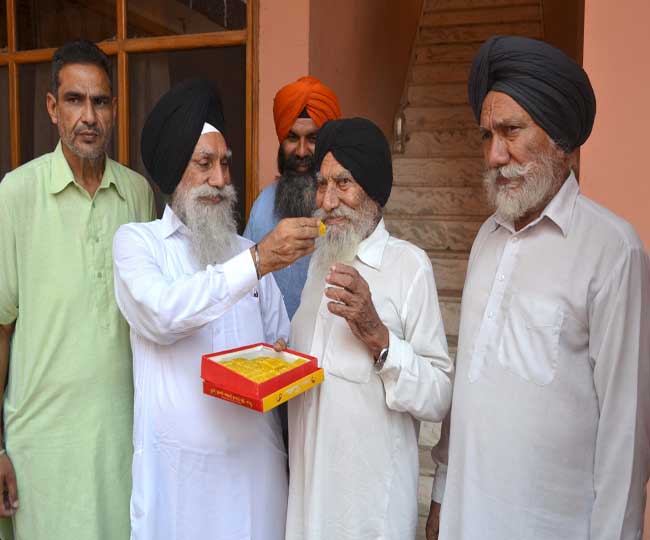 तनमनजीत सिंह ढेसी के पैतृक गांव रायपुर फराला में लोगों का मुं‍ह मीठा करवाते परिजन।