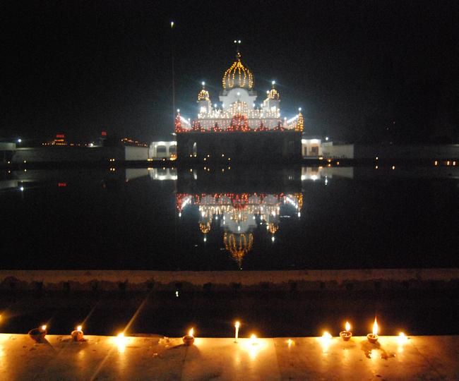 फरीदकोटः गुरुपर्व के अवसर पर सजाया गया जैतो का श्री गंगसर साहिब गुरुद्वारा। तस्वीर में श्रद्धालुओं द्वारा गुरुपर्व पर जलाए गए दीपक तथा सजाए गए गुरुद्वारा साहिब का बिंब सरोवर में दिखाई दे रहा है। फोटो-भोला शर्मा