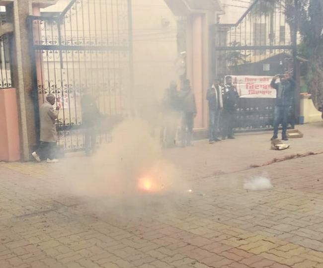 पूर्व बिशप फ्रैंको मुलक्कल को बरी किए जाने के बाद जालंधर में बिशप हाउस के बाहर आतिशबाजी करते हुए ईसाई भाईचारे के सदस्य। यहां लड्डू बांटकर फैसले की खुशी मनाई गई है।