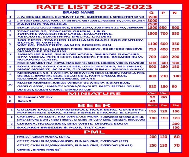 इसके अलावा बीयर में गोल्डन ईगल, थंडर बोल्ड, राक बर्ग, जैनस बर्ग, हावर्ड 5000, किंगफिशर स्ट्रांग एंड लाइट 150 रुपये बोतल व कैन 120 रुपये रेट निर्धारित किए गए हैं। इसके साथ ही करोना, बीरा बाइट व आरेंज बूम 200 रुपये व बकार्डी ब्रीजर 100 रुपये रेट निर्धारित किए गए हैं।