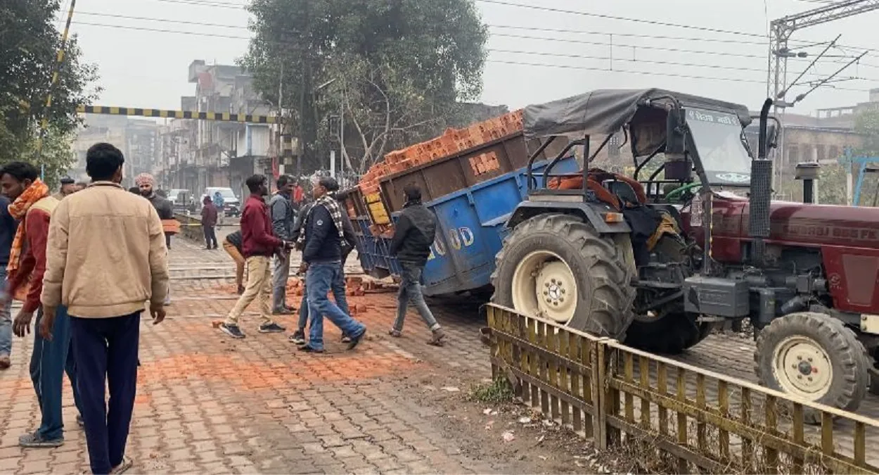 रेलवे फाटक के बीचों बीच पलटी ट्राली।