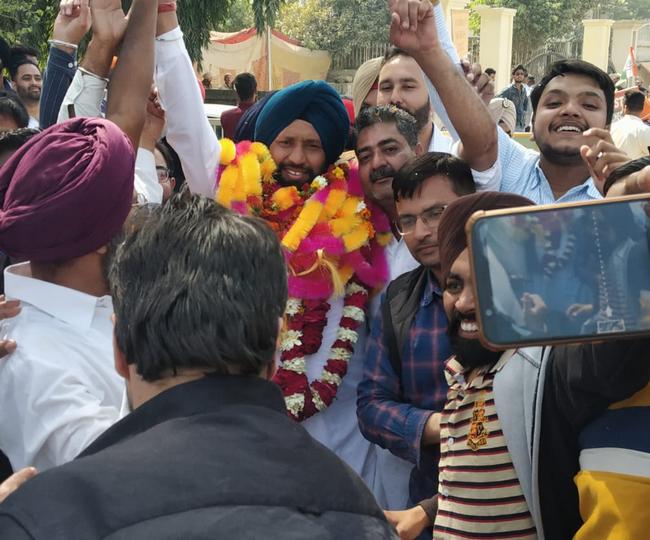 जीते के बाद जश्न मनाते हुए करतारपुर से आप प्रत्याशी बलकार सिंह।