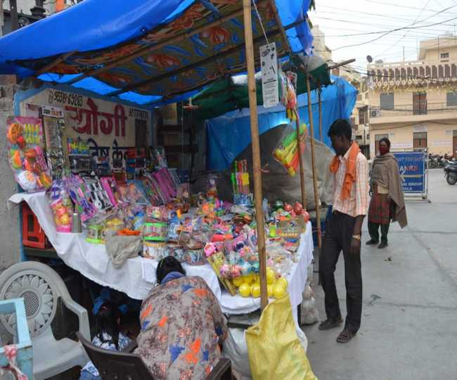 प्राचीन शीतला मंदिर में लगे मेले के दौरान सजी दुकानें ।