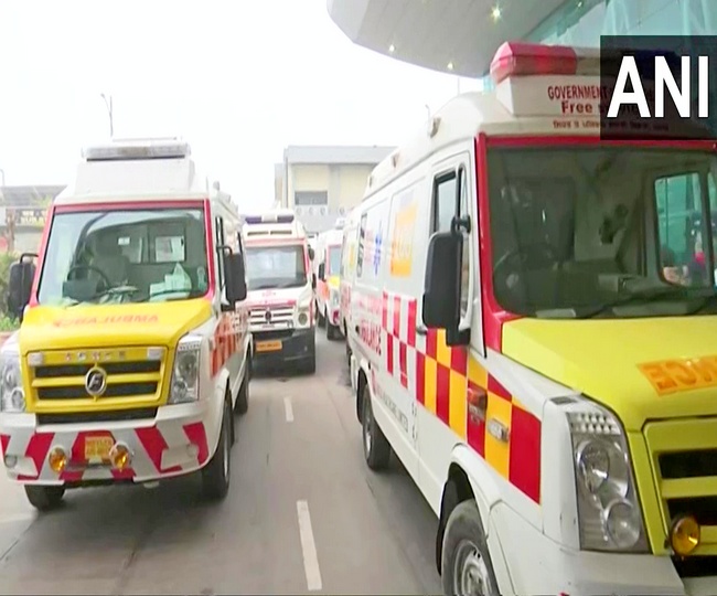 अमृतसर एयरपोर्ट पर पाजिटिव निकले यात्रियों को आइसोलेशन में लेकर जाती हुईं एंबुलेंस।