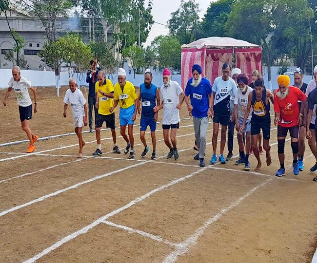 संगरूर में वेटरन दौड़ शुरू होने से पहले बख्शीश सिंह और अन्य प्रतिभागी। दौड़ जीतने के बाद उन्हें हार्ट अटैक पड़ गया था।