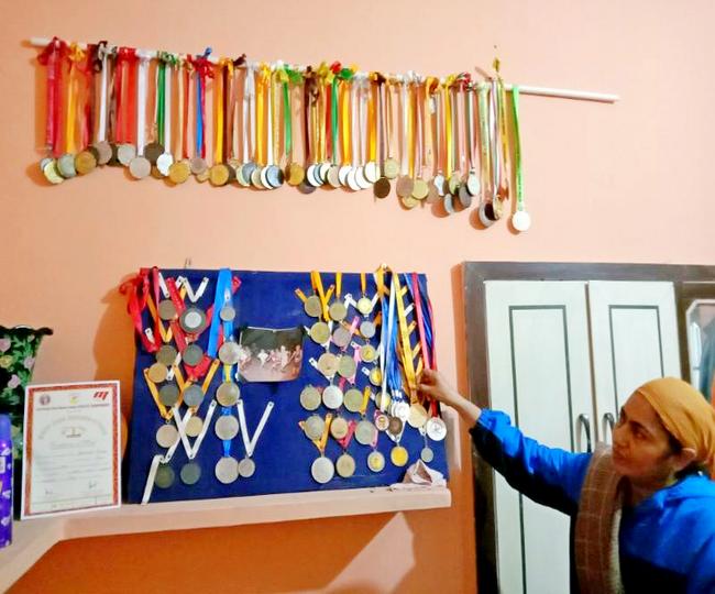 अपने पिता बख्शीश सिंह के जीते मेडल दिखाती हुईं उनकी बेटी डॉ. खुशवंत कौर।