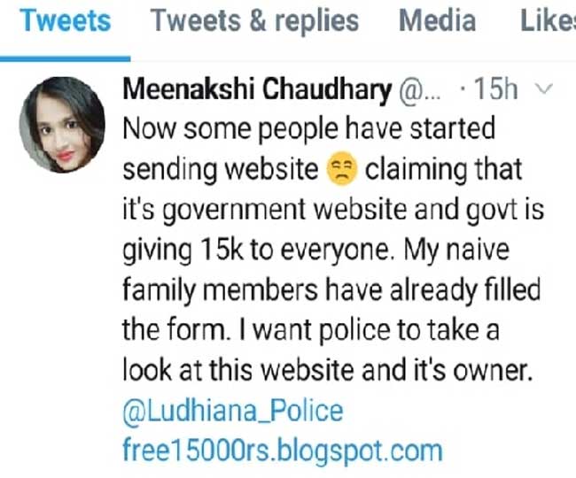 मीनाक्षी चौधरी नाम की महिला ने ट्वीट करते हुए लिखा है कि अब कुछ लोगों की तरफ से लिंक भेजकर कहा जा रहा है कि यह सरकारी वेबसाइट है, सरकार 15 हजार रुपये देने जा रही है। उनके परिवार ने इसमें दिए फार्म को भर दिया। पुलिस को इस वेबसाइट की जांच करवानी चाहिए और इसके संचालक को तलाश करना चाहिए। उन्होंने ट्विटर हेंडल पर वेबसाइट का लिंक भी शेयर किया है। मीनाक्षी ने इसे लुधियाना पुलिस के ट्विटर पर भी टैग करके सीपी से इसकी जांच की मांग की है। वहीं सीपी ने रिप्लाई में कहा है कि यह सरासर गलत है और इसकी जांच करवाएंगे।
