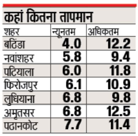 नवांशहर में अधिकतम तापमान 9.4 और न्यूनतम तापमान 5.8 तथा लुधियाना में अधिकतम तापमान 9.8 और न्यूनतम तापमान 6.8 डिग्री सेल्सियस दर्ज किया गया। लुधियाना में 1970 के बाद यानी 53 साल बाद 19 जनवरी को दिन का तापमान 9.8 डिग्री सेल्सियस रिकॉर्ड किया गया