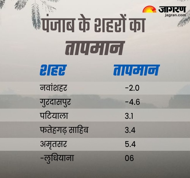 जागरण टीम, लुधियाना। पंजाब में कोहरा व कड़ाके की ठंड चरम पर है। अधिकांश जिलों में मंगलवार सुबह घना कोहरा रहा व शीतलहर चली। नवांशहर में दूसरे दिन मंगलवार को भी न्यूनतम तापमान माइनस (-0.4 डिग्री) में रहा। यहां सोमवार को न्यूनतम तापमान -0.2 डिग्री था। यहां अधिकतम तापमान 15 डिग्री रहा।