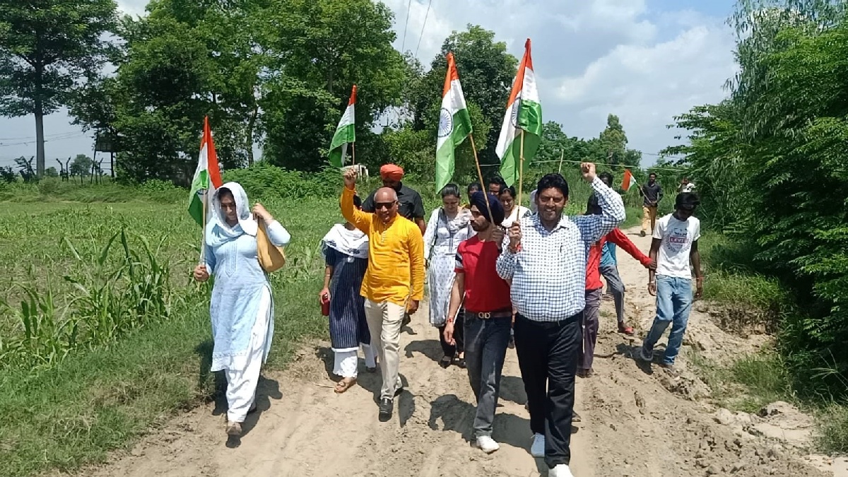 आजादी के 75वें महोत्सव के जश्न कैसे मनाया जा रहा है, गांव वालों को नहीं पता। गांव वालों ने बीएसएफ का फ्लैग मार्च तो देखा, लेकिन इस उत्सव में कैसे शामिल हों किसी को पता नहीं। छोटे गांव में महज पचास घर हैं और आबादी 150 के करीब। साधन कम होने के कारण रोजमर्रा के काम और खाने की चिंता। ऐसे में जश्न का सवाल जहन में नहीं आता। शहीद भगत सिंह कालेज और सरहदी लोक सेवा समिति के सदस्य शनिवार को तिरंगे लेकर गांव पहुंचे तो आजादी के महोत्सव का रंग बदला। गांव वालों ने घरों की छतों पर तिरंगे सजा संस्थाओं के साथ मिलकर भारत माता के जयघोष लगाए।