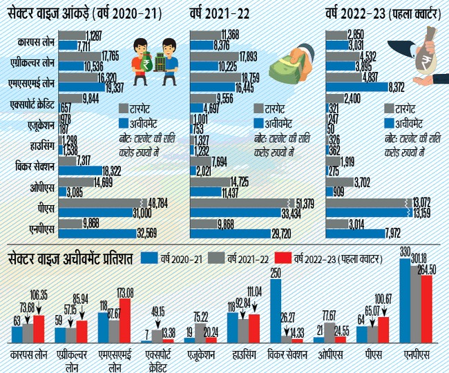 वहीं बात हाउसिंग की करें, तो इसमें 111.04 प्रतिशत अचीवमेंट की गई है। इसी प्रकार एनपीएस में 264.50 प्रतिशत की अचीवमेंट है। फसल पर लोन की अचीवमेंट 106.35 रही है। हालांकि इस साल की पहली तिमाही में कई सेक्टर के टारगेट अचीव नहीं हो पाए हैं। इसमें सबसे अधिक निराशाजनक स्थित एक्सपोर्ट क्रेडिट में रही है, जिसमें महज 13.38 प्रतिशत टारगेट अचीव हुआ है। इससे यह अंदाजा लगाया जा सकता है कि बैंकिंग सेक्टर की हालत अब धीरे-धीरे सुधर रही है।