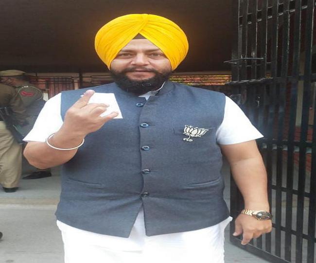 गुरदीप गोशा अपने सीने पर कमल का निशान लगा कर वोट डालने पहुंचे। (जागरण)
