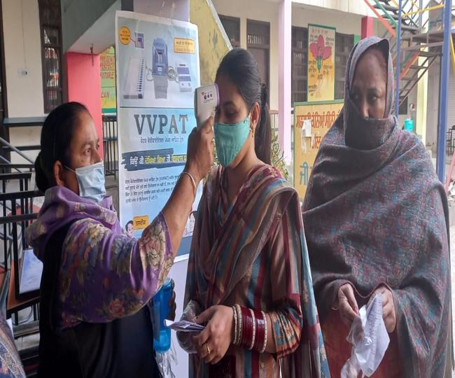 पाेलिंग बूथ में जाने से पहले वाेटराें काे थर्मल स्कैनिंग से गुजरना पड़ा। (जागरण)