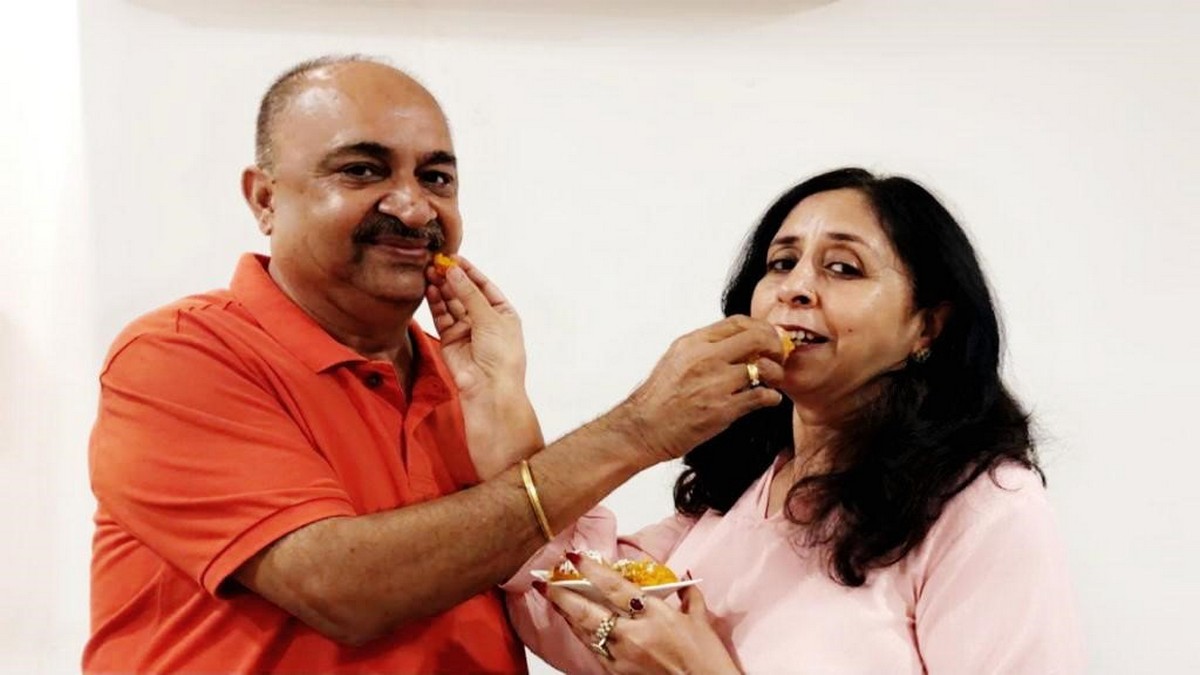 बेटी की जीत के बाद एक दूसरे का मुंह मीठा करवाते हुए पति -पत्नी