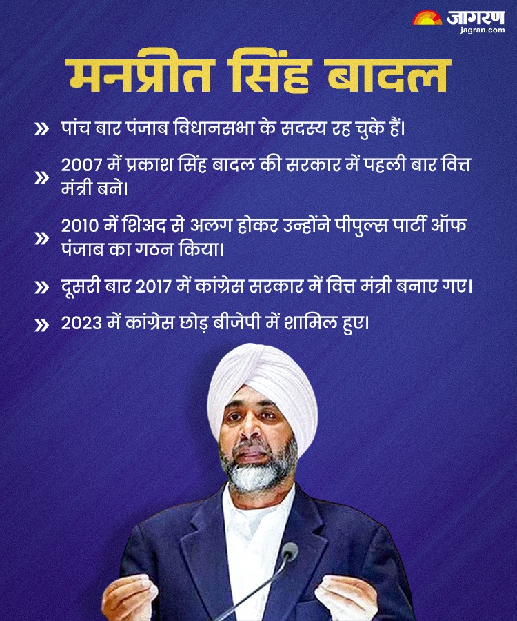 62 वर्षीय मनप्रीत सिंह बादल पांच बार (1995, 1997, 2002, 2007, 2017) पंजाब विधानसभा के सदस्य रह चुके हैं और दो बार वित्त मंत्री रह चुके हैं। वित्त मंत्री के रूप में उनका पहला कार्यकाल 2007 से 2010 तक प्रकाश सिंह बादल के नेतृत्व वाली सरकार में था।