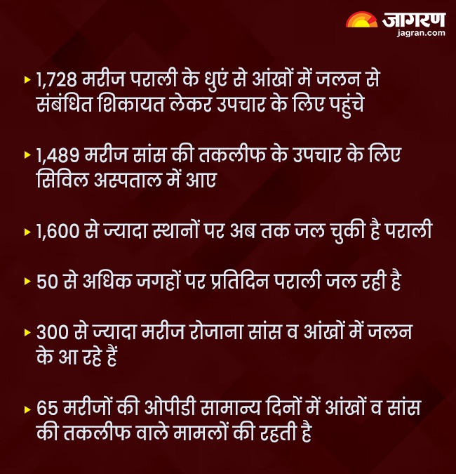 पराली जलाने के कारण लोगों के स्वास्थ्य में काफी बुरा प्रभाव पड़ रहा है, लोगों को सांस संबंधी बीमारियों के साथ ही आंखों में जलन जैसी समस्याएं भी हो रही हैं। इसके चलते प्रदेश में मरीजों की संख्या में लगातार इजाफा हो रहा है। आंकड़ों के हिसाब से जानते हैं कि कितने मरीज किस बीमारी से पीड़ित हैं।