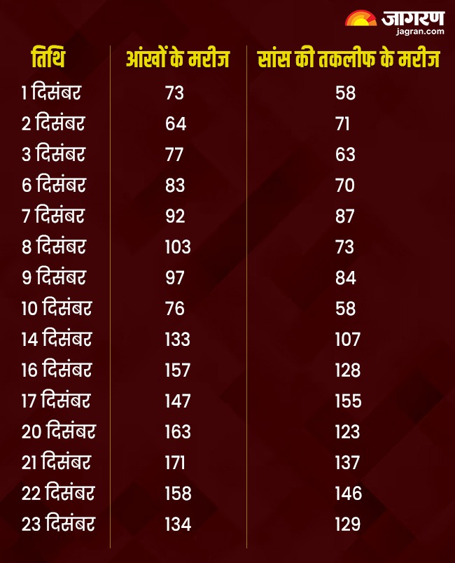 सिविल अस्पताल के एसएमओ डॉ.राहुल जिंदल ने विशेषज्ञ डाक्टरों को ऐसे मरीजों का अच्छे ढंग से चेकअप कर उन्हें दवाएं मुहैया करवाने के लिए विशेष निर्देश दिए हैं। सिविल अस्पताल में अब तक नवंबर माह में आंखों में जलन और सांस की तकलीफ के कितने मरीज उपचार के लिए पहुंचे, आइए इस पर डालते हैं एक नजर।