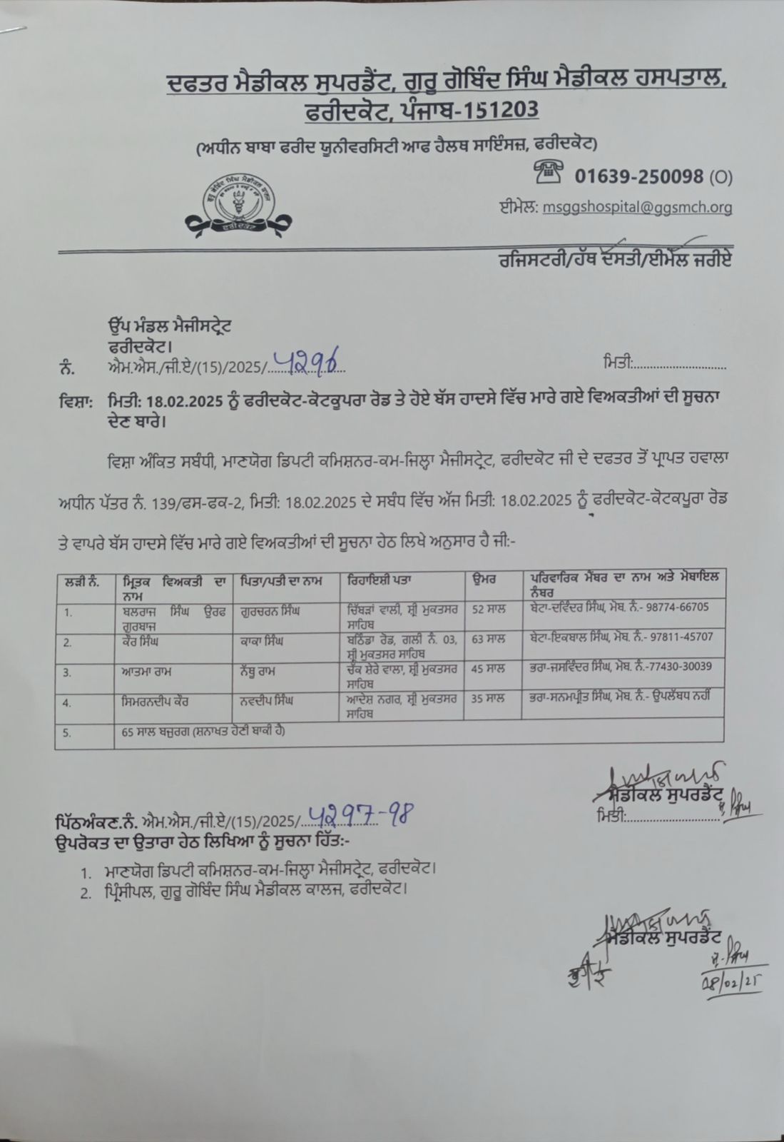 उधर, नवनियुक्त डिप्टी कमिश्नर अभिजीत कपलिश ने कहा कि घायलों की हर संभव मदद की जाएगी।घायलों की पहचान -सिविल अस्पताल मलोट में भर्ती घायल की पहचान अमनदीप कौर,अंजू, पार्वती वासी गांव माहूआना,लाभ सिंह वासी हरियाणा, सतवंत कौर गांव रोड़ांवारी, सुनील कुमार वासी महिना,सरिता वासी मुक्तसर,सोमा वासी अबोहर रोड मुक्तसर और मुक्तसर अस्पताल में भर्ती सिमरजीत कौर वासी शाम खेड़ा के रूप में हुई है