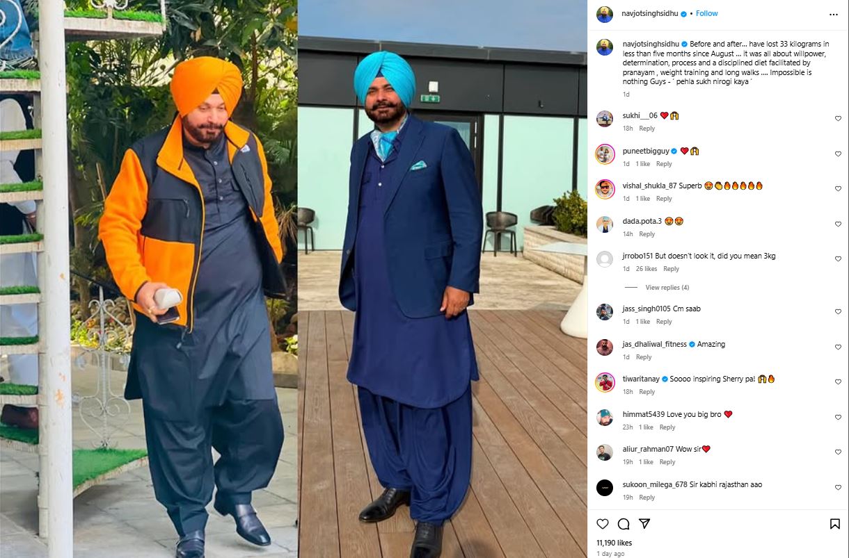 पूर्व क्रिकेटर ने कोलॉज बनाकर दो तस्वीरें शेयर की हैं। एक पांच महीने पहले की और एक अब की। तस्वीर के नीचे कैप्शन में नवजोत सिंह सिद्धू ने लिखा कि आहार, प्राणायाम और लंबी सैर ने उन्हें इस फिटनेस लक्ष्य को हासिल करने में मदद की है।