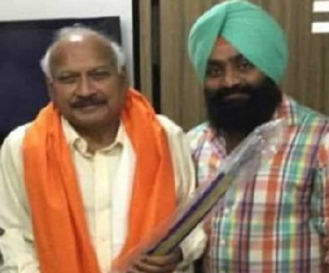 पुलिसकर्मी की पिटाई करने वाला एक आरोपित मनी (पगड़ी पहने) मंत्री ब्रह्ममोहिंदरा के साथ। फाइल फोटो