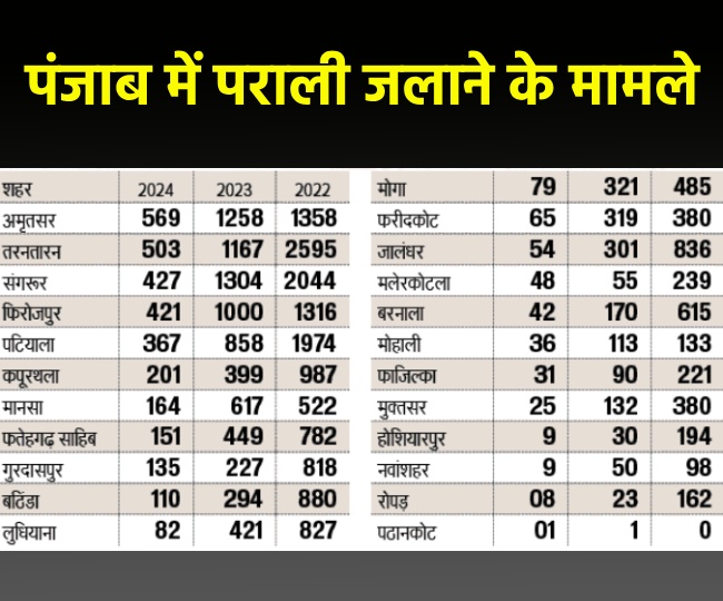पंजाब में पराली जलाने की घटनाओं में वृद्धि के कारण राज्य के कई शहरों का वायु गुणवत्ता सूचकांक (एक्यूआइ) खराब स्थिति में पहुंच गया है। दीपावली के दौरान पटाखे चलाने और पराली जलाने से अमृतसर जालंधर और लुधियाना का एक्यूआइ 500 तक पहुंच गया। राज्य में पराली जलाने के मामले लगातार बढ़ रहे हैं और अब तक 3537 मामले सामने आ चुके हैं।