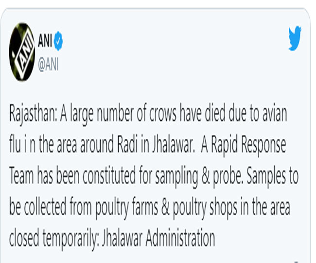 राजस्थान के झालावाड़ में रेडी के आसपास एवियन फ्लू के कारण बड़ी संख्या में कौओं की मौत हो गई है। नमूने और जांच के लिए एक रैपिड रिस्पांस टीम का गठन किया गया है। झालावाड़ प्रशासन ने क्षेत्र में पोल्ट्री फार्म और पोल्ट्री की दुकानों से एकत्र किए जाने वाले नमूने जांच के लिये भेजा है।
