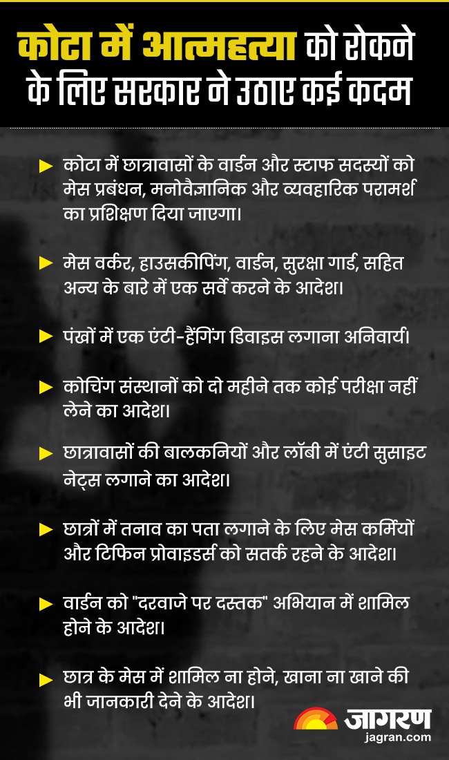 न्यूज एजेंसी PTI के अनुसार, अब राज्य सरकार की ओर से कोटा में छात्रावासों के वार्डन और स्टाफ सदस्यों को मेस प्रबंधन, मनोवैज्ञानिक और व्यवहारिक परामर्श और छात्रों की देखभाल के अन्य पहलुओं में पेशेवर प्रशिक्षण दिया जाएगा ताकि उन्हें कोचिंग हब में उम्मीदवारों द्वारा आत्महत्या की बढ़ती संख्या से लड़ने के लिए तैयार किया जा सके।