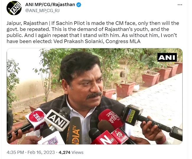कांग्रेस विधायक वेद प्रकाश सोलंकी ने दावा किया कि सचिन पायलट को मुख्यमंत्री का चेहरा बनाने पर कांग्रेस एक बार फिर से सत्ता में आएगी। समाचार एजेंसी एएनआई के साथ बातचीत में उन्होंने कहा कि अगर सचिन पायलट को नेतृत्व देते हैं तो 100 फीसदी सत्ता रिपीट होगी। जनता अगर ये चाहती है तो होना चाहिए।