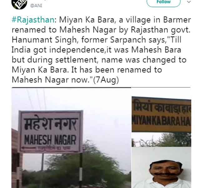 राजस्थान के बाड़मेर के एक गांव मियों का बाड़ा के नाम को राजस्थान सरकार द्वारा महेश नगर का नाम बदल दिया।