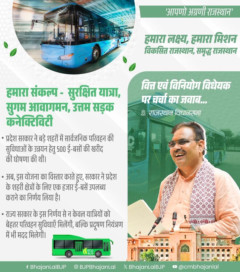 इसके अलावा भजन लाल शर्मा ने यह भी घोषणा की कि राजस्थान सरकार अब 500 की जगह 1000 इलेक्ट्रिक बसें खरीदेगी, जैसा कि पहले बजट भाषण में घोषित किया गया था। भजन लाल ने कहा कि 10,000 से अधिक आबादी वाले गांवों में अटल प्रगति पथ का निर्माण भी किया जाएगा।