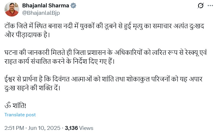 इस घटना पर राजस्थान के सीएम भजनलाल शर्मा ने भी एक्स पर पोस्ट किया है, उन्होंने पोस्ट में दुख जताया है।