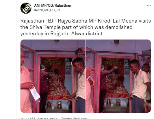 11: 36 AM- भाजपा के राज्यसभा सांसद किरोड़ी लाल मीणा ने अलवर जिले के राजगढ़ में शिव मंदिर के उस हिस्से का दौरा किया, जिसे कल ध्वस्त कर दिया गया था।