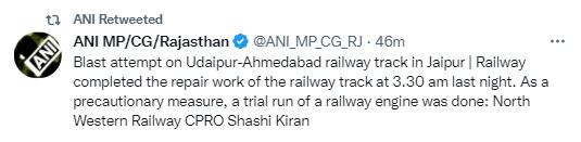 केंद्रीय रेल मंत्री अश्विनी वैष्णव का कहना है कि उदयपुर से लगभग 35 किलोमीटर दूर रेल ट्रैक हुए ब्लास्ट की एटीएस, एनआइए व रेलवे की आरपीएफ टीमें जांच करने में लगी हुई है। आरोपित के पकड़े जाने पर उसे कड़ी से कड़ी सजा दी जाएगी।