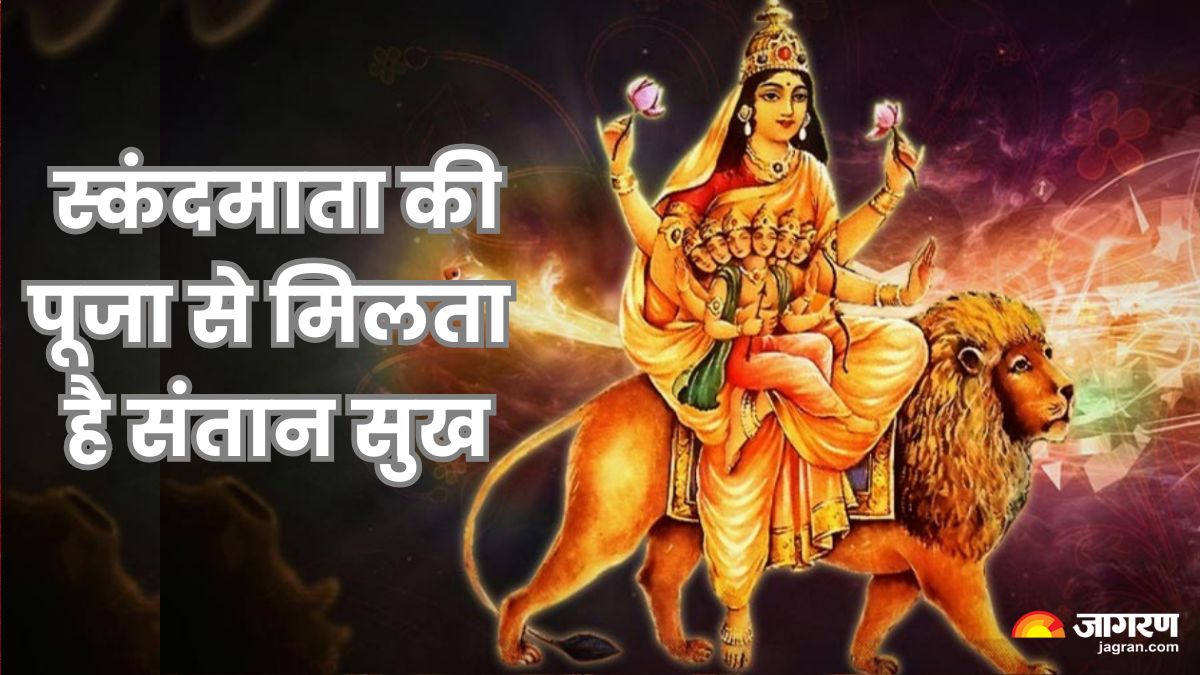 स्कंद माता की पूजा करने से निसंतान दंपतियों को संतान सुख की प्राप्ति होती है। वह अपनी गोद में स्कंद देव को बैठे हुए हैं। कमल आसन पर शेर पर सवार मां के एक हाथ में कमल का फूल है और दूसरे हाथ से वह अपने पुत्र स्कंद को प्रेम से पकड़े हुए हैं।