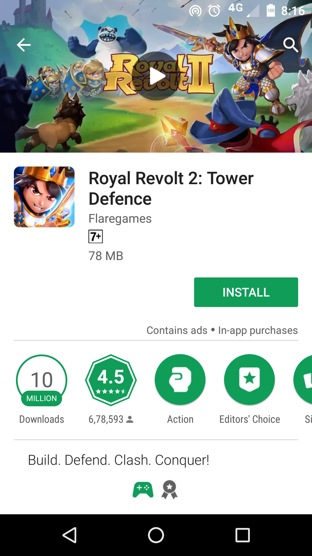 Royal Revolt 2: एप को 1 करोड़ यूजर्स ने डाउनलोड किया है। एप को प्ले स्टोर पर 4.5 स्टार मिला है। एप को 6 लाख से ज्यादा यूजर्स ने रेटिंग दी है। एप की साइज 78 एमबी है।