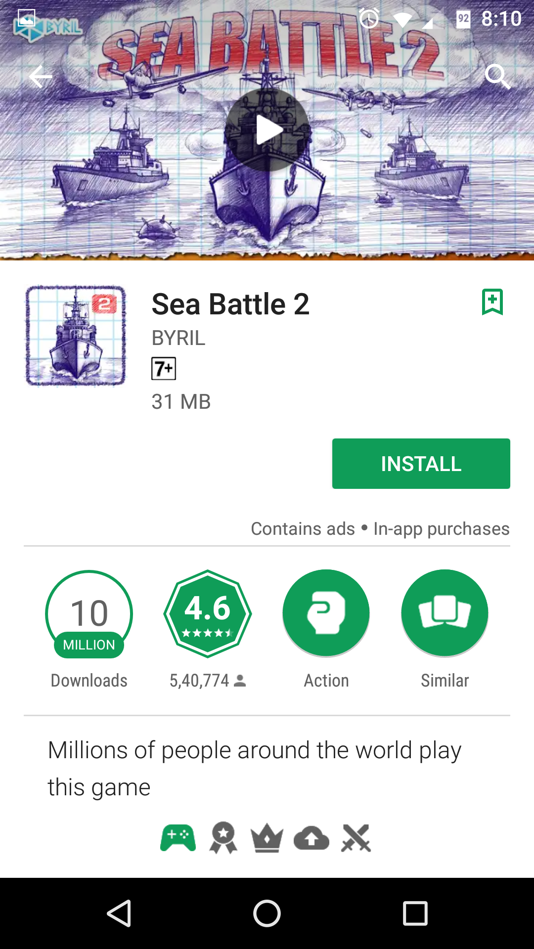 Sea Battle 2: एप को 1 करोड़ यूजर्स ने डाउनलोड किया है। एप को प्ले स्टोर पर 4.6 स्टार मिला है, जिसे 5 लाख से ज्यादा यूजर्स ने रेटिंग दी है। एप की साइज 31 एमबी है।