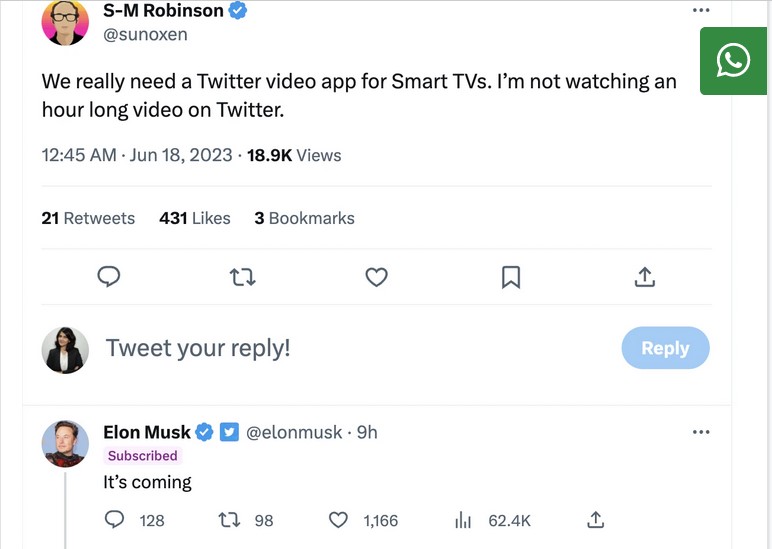 मस्क ने प्लेटफॉर्म पर एक यूजर के साथ बातचीत करते हुए एक ट्विटर वीडियो ऐप की घोषणा की। जब एक ट्विटर यूजर ने उल्लेख किया कि स्मार्ट टीवी के लिए ट्विटर वीडियो ऐप की आवश्यकता कैसे है क्योंकि फोन पर लंबे वीडियो देखना वास्तव में संभव नहीं है, तो मस्क ने उनके ट्वीट का जवाब दिया और कहा, 'यह आ रहा है'।