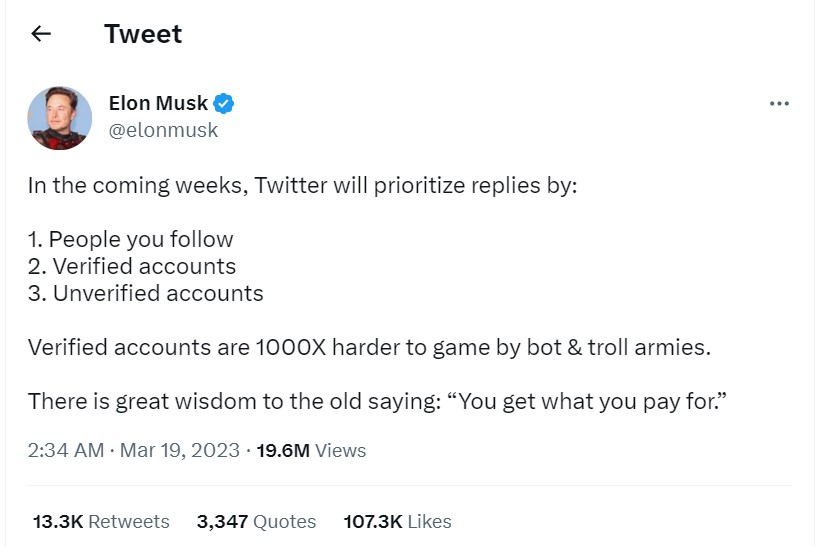 मस्क ने पहले संकेत दिया था कि वेरीफाइड अकाउंट के ट्वीट्स को प्राथमिकता दी जाएगी। इससे जल्द ही घोटालों और स्पैम से लड़ने में मदद मिलेगी। प्रीमियम ब्लू टिक सब्सक्रिप्शन के लॉन्च के बाद से, ट्विटर राजस्व बढ़ाने के लिए भुगतान किए गए, वेरीफाइड यूजर को कई लाभ देने की कोशिश कर रहा है।