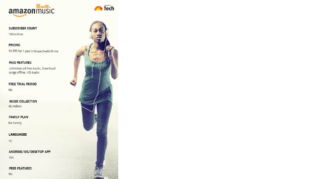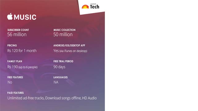Apple Music: इसमें तीन पैक हैं। पहला स्टूडेंट्स के लिए हैं। इसके लिए यूजर्स को 6 रुपये प्रति महीने देने होंगे। दूसरे व्यक्तिगत इस्तेमाल के लिए जिसमें यूजर्स को 120 रुपये प्रति महीने देने होंगे। वहीं, तीसरा फैमिली पैक जिसके लिए 190 रुपये प्रति महीने देने होंगे। कंपनी यूजर्स को तीन महीने का फ्री ट्रायल भी उपलब्ध करा रही है। इसे iTunes, iOS और Android पर उपलब्ध कराया जाता है।