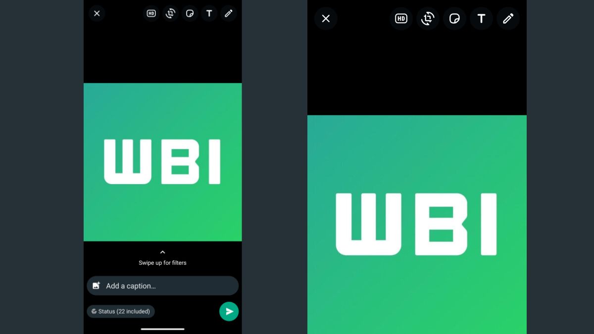 वॉट्सऐप पर स्टेटस लगाने के दौरान फोटो और वीडियो की क्वालिटी HD रखने के लिए HD ऑप्शन पर टैप करना होगा। यह ऑप्शन स्टेटस स्क्रीन पर ऊपर की ओर नजर आएगा।