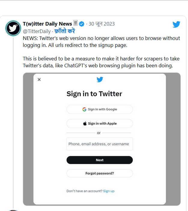मस्क ने एक ट्वीट में कहा है कि जो यूजर्स प्लेटफॉर्म पर कंटेंट देखने का प्रयास करते हैं, उन्हें अपने पसंदीदा ट्वीट देखने के लिए साइन इन करने के लिए कहा जाएगा। आसान भाषा में कहें तो अगर आप कोई ट्वीट देखना चाहते हैं तो आपको ट्विटर पर अपनी आईडी बनानी होगी। मस्क ने आगे कहा है कि ट्विटर यूजर्स का डेटा लुटा जा रहा था।