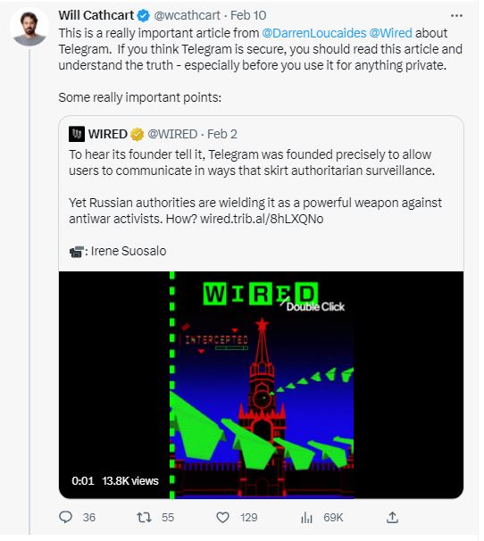 कैथकार्ट ने वायर्ड के एक लेख का हवाला देते हुए कहा कि अगर आपको लगता है कि टेलीग्राम सुरक्षित है, तो आपको इस लेख को पढ़ना चाहिए और सच्चाई को समझना चाहिए। इससे पहले कि आप इसे निजी तौर पर इस्तेमाल करें। कार्यकारी ने टेलीग्राम के एंड-टू-एंड एन्क्रिप्शन (E2EE) के कार्यान्वयन की अपनी व्यक्तिगत आलोचना भी साझा की। बता दें कि उन्होंने एक ट्विटर पोस्ट में ऐसा कहा था।