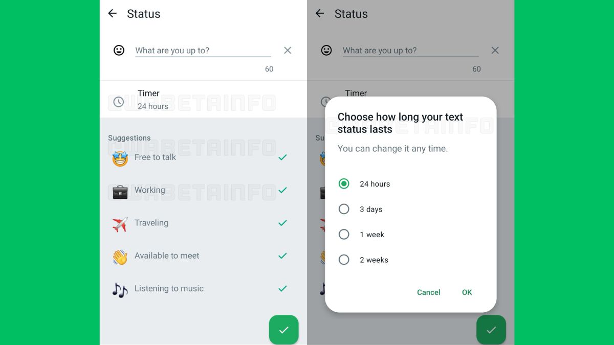 इन ऑप्शन के साथ यूजर यह तय कर सकेगा कि उसका टेक्स्ट स्टेटस कितने समय तक कॉन्टेक्ट्स के लिए विजिबल रहेगा। स्टेटस सेटिंग के लिए यूजर को 24 घंटे, 3दिन, 1 हफ्ते और अधिकतम 2 हफ्तों तक का समय मिलेगा।