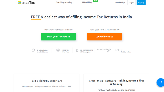 क्लियर टैक्स इनकम टैक्स रिटर्न करने के लिए सबसे अच्छा विकल्प कहा जा सकता है। उनके पास विस्तार में डिटेल्स मौजूद है। अगर आपकी कंपनी आपको पीडीएफ फॉर्म में, फॉर्म 16 देती है तो आप उसे साइट पर अपलोड कर सकते हैं और फाइल से जरुरी जानकारी अपने आप ले ली जाएगी। इससे फाइलिंग प्रक्रिया ओर भी तेजी से हो जाती है। सेल्फ-फाईलिंग के लिए आपको कुछ पे नहीं करना होगा। क्लियरटैक्स 599 रुपये में CA की मदद भी उपलब्ध करता है जो की काफी किफायती है।