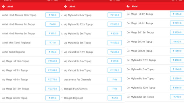Airtel Digital TV के इन कॉम्बो पैक्स में यूजर्स को HD और SD चैनल्स मिलेंगे। ये पैक्स देश के सभी क्षेत्र के लिए अलग-अलग होंगे। तेलुगू यूजर्स के लिए AP Mega HD, AP Mega SD, MP MyFam HD, AP MyFam SD, AP Value Sports HD जैसे पैक्स मिलेंगे। ये पैक्स तीन महीने, 6 महीने और सालाना पैक्स के तौर पर उपलब्ध हैं। मान लीजिए की आप तेलुगू यूजर्स हैं और आपने AP Mega HD का चुनाव किया है तो इसके लिए आपको 273 रुपये प्रति महीने बिना NCF के देना होता है। आप इस पैक को तीन महीने के लिए लेते हैं तो इसके लिए आपको 819 रुपये का भुगतान करना होता है। मंथली पैक के साथ आपको 130 रुपये (बिना टैक्स के) का भुगतान करना होता है जबकि 3 महीने वाले पैक के साथ आपको NCF चार्ज नहीं देना होता है। इसी तरह 6 महीने के पैक के लिए आपको 1,638 रुपये और 1 साल के पैक के लिए आपको 3,276 रुपये का भुगतान करना होता है।